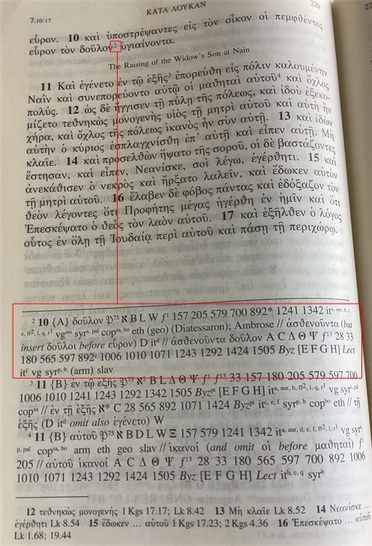 Apparat critique dans le Greek New Testament pour Luc 7, 10 Dans leur analyse, la plupart des biblistes utilisent le The Greek New Testament publié conjointement par Deutsche Bibelgesellschaft, American Bible Society, United Bible Societies, sous la direction de Kurt Aland et alii. Or, cette édition présente une version éclectique du Nouveau Testament, car les éditeurs ont déjà fait des choix entre les diverses variantes, des choix auxquels ils ont accolé une cote {a}, {b}, {c}, {d} selon le degré de certitude d’avoir fait le bon choix, {a} désignant le plus haut niveau de certitude, {d} le plus bas. Notons que cette édition du Nouveau Testament grec se limite aux variantes les plus importantes. Pour une liste plus extensive de variantes, il faut utiliser le Novum Testamentum Graece de Nestlée-Aland. Une approche méthodique dans la critique textuelle propose quatre étapes.